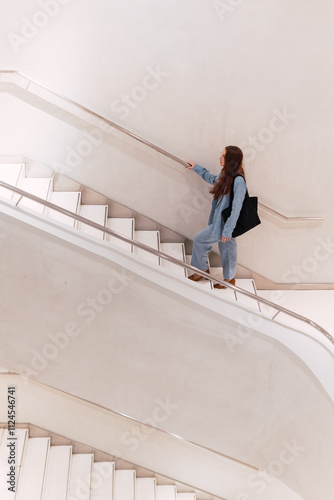 woman, trendy, female, style, feminine, lady, fashion, garment, apparel, lifestyle, railing, white, hallway, corridor, staircase, staircase, hall, design, step, stair, wall, roomy, inside, outfit, long hair, accessory, anonymous, unrecognizable, attire, half face, elegant, faceless, vertical, wear, walk, pursed, lobby