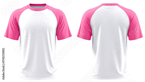 t-shirt, white, pink, trim, sleeve, collar, sport, athletic, casual attire, garment, design, fashion, apparel, clothing, unisex, short, summer, style, simple, colours, modern, blank, template, product, digital, illustration, rendering, front, back, view, graphic, activewear