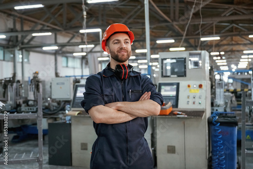 Front view. Factory worker is indoors with hard hat