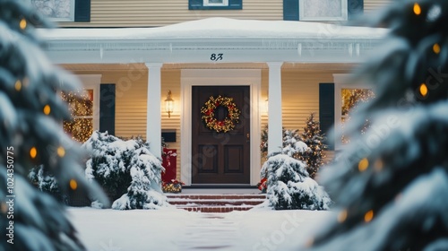 Front view of a charming house with a Christmas wreath on the front door and snow-laden trees in the yard.