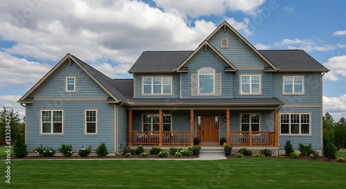 Front View of a Spacious Two-Story Blue-Gray Home with a Blend of Wood and Vinyl Siding