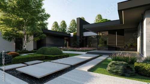 front yard of a suburban modern home with a minimalist approach, featuring a monochrome color scheme and sharp angles