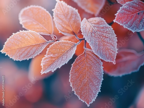 Frosted autumn leaves show winter's arrival, with icy edges and soft colors, capturing the cold beauty and seasonal transition.