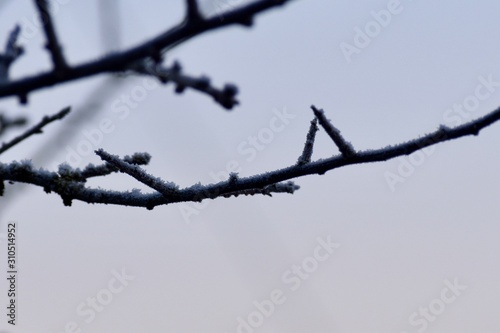 sky, fence, barbed, tree, winter, tree branch, nature, snow, barb, blue, sharp, steel, ice, cold, white, spring, branch