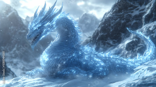 majestic, breathtaking, winter, vibrant, artistic, mystical, mountain, serene, cold, snow, blue, realistic, three-dimensional, powerful, frost, legendary, creature, stunning, aethereal, magical, artwork, fantasy, glacé, digital artwork, graphic design, icy, illustration, ice, snowy, dragon, beautiful