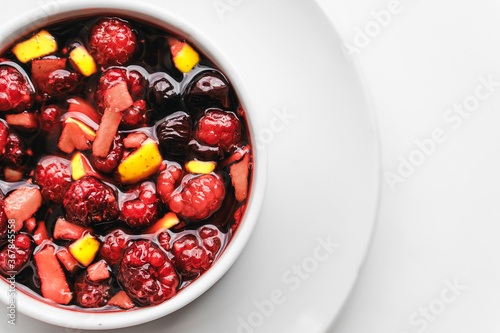 Fruit salad on white background. Healthy breakfast concept.