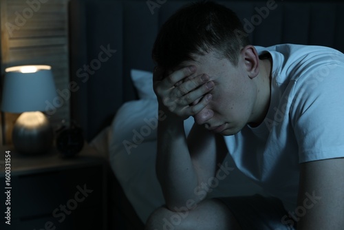 adult, anxiety, awake, background, bed, bedchamber, bedtime, closeup, copy, depressed, disorder, disturbed, exhausted, fatigue, frustrated, cephalalgia, health, home, house, disease, indoor, insomnia, lifestyle, male, man, night, nightmare, pain, person, problem, room, sick, sleep, sleepless, sleeplessness, sleepy, space, stress, stressed, suffering, text, sleepy, trouble, unhappy, unhealthy, unwell, upset, worried, young