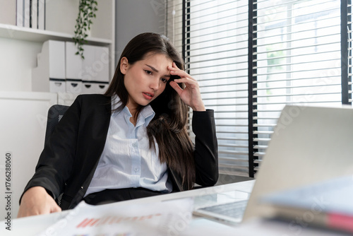 Frustrated Mixed race businesswoman overwork late in office workplace.