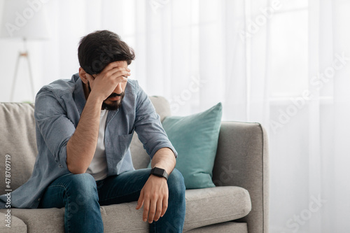 Frustrated young man sitting on sofa in living room, touching his forehead, suffering from loneliness, empty space
