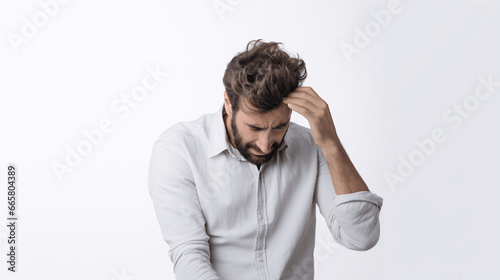 person, cephalalgia, expression, people, face, head, business, pain, guy, businessman, photogenic, boy, stress, sleepy, shirt, casual attire, hand, 1, sad, standing, white background, worried, ache, man, emotion
