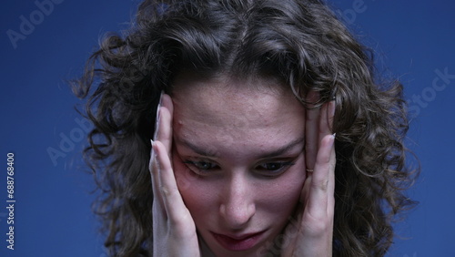 Frustrated young woman covering face with hands feeling regret and anxiety, close-up face of female person in 20s having shame about past memories