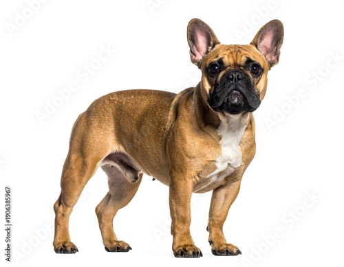 dog, animal, mammal, pet, canino, bulldog, french, breed, brown, white, background, studio, shot, full, body, standing, portrait, isolated, looking, camera, face, head, ear, nose, eye, paw, fur, skin, coat, cute, adorable, domestic, companion, pedigree, purebred, well-groomed, alert, focused, posture, pose, elegant, healthy, vibrant, charming