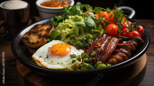 Full English breakfast with crispy bacon, soft scrambled eggs, stewed plum tomatoes, garlic mushrooms, hash browns and grilled onions on wooden table