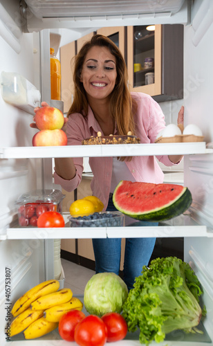 young, woman, full, refrigerator, vegetable, kitchen, nourishment, healthy, food, shelf, human, vegetarian, health care, cold, background, homemaker, concept, indoor, cool, cooking, domestic, freshness, pretty, cheerful, fruit, organic, smile, meal, refrigerator, open, person, female, home, fresh, diet, caucasian, beautiful, adult, inside, vegetable, ravenous, eat, deep freezer, girl, dieting, snack, lifestyle, casual attire, health, beauty