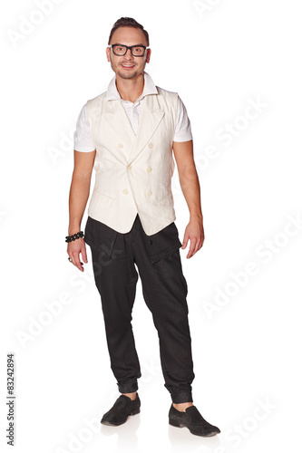 adult, attractive, casual attire, caucasian, charming, cheerful, confident, content, cool, elegant, eyeglass, fashion, fashionable, friendly, front view, full-length, funky, goggles, guy, photogenic, individuality, isolated, lifestyle, male, man, model, modern, 1, people, person, portrait, positive, satisfied, smile, standing, stubble field, student, studio, style, stylish, trendy, unshaved, white background, young, relaxed, carefree, calm