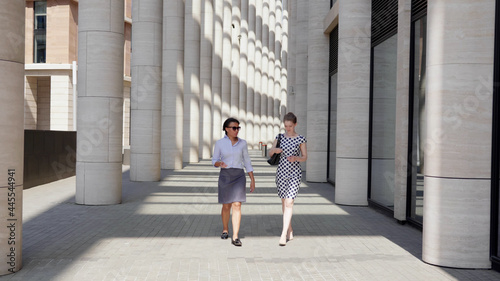 full, length, african, businesswoman, caucasian, partner, walking, street, chatting, female, walk, outside, office, building, negotiate, work, afro, diverse, center, business, beautiful, break, conversation, people, cheerful, city, colleague, confident, corporate, discussing, discussion, executive, fashionable, woman, formal, wear, happy, manager, employee, professional, senior, smile, successful, talk, team, urban, background, talking