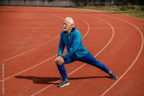 Full length of an old athlete stretching his legs on stadium.