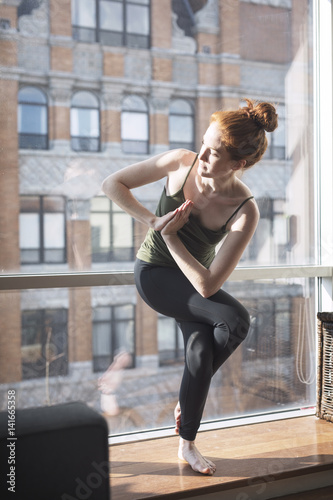 woman, exercising, window, home, yoga, lifestyle, balance, glasses, relaxation, transparent, posture, standing, practicing, confidence, meditating, sunlight, looking away, well-being, healthy lifestyle, avocation, domestic life, front view, full-length, day, indoor, one person, young adult, missy, female