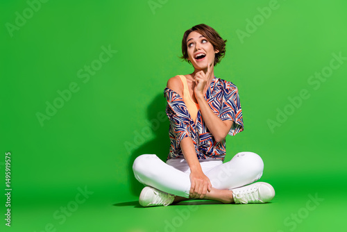 Full length photo of excited funky woman wear print shirt finger chin sitting legs crossed looking empty space isolated green color background