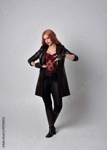 full length portrait of girl with long red hair wearing dark leather coat, corset and boots. Standing pose facing front on with magical hand gestures against a studio background.