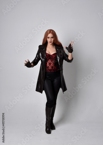 full length portrait of girl with long red hair wearing dark leather coat, corset and boots. Standing pose facing front on with magical hand gestures against a studio background.