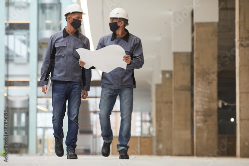 Full length portrait of two workers wearing masks and holding plans while walking towards camera at construction site, copy space