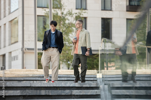Full length shot of two male IT developers in stylish outfits talk business during walking meeting or daily commute to work while descending steps outside in city street, copy space