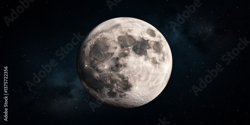Full moon glowing over deep space with detailed craters and starry sky for astronomy, science or night sky exploration themes