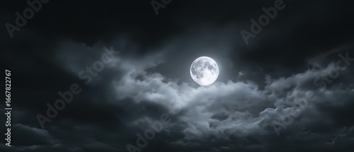 Full Moon Illuminates Dark Cloudy Night Sky with Bright Lunar Glow and Mystical Atmosphere