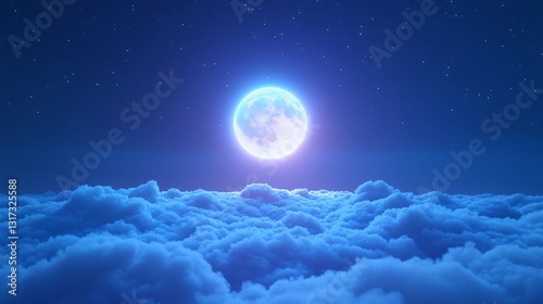 Full moon shining brightly, tranquil night sky above soft, fluffy clouds, calming atmosphere perfect for relaxation and reflection.