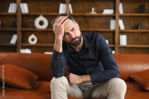 Full of doubts caucasian guy sitting on the sofa at home. Frustrated pensive man worried about future, covering forehead with hand, thinking about troubles and problems