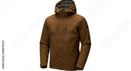 Full shot of a brown waterproof jacket with a hood. Features zippered pockets and a practical design