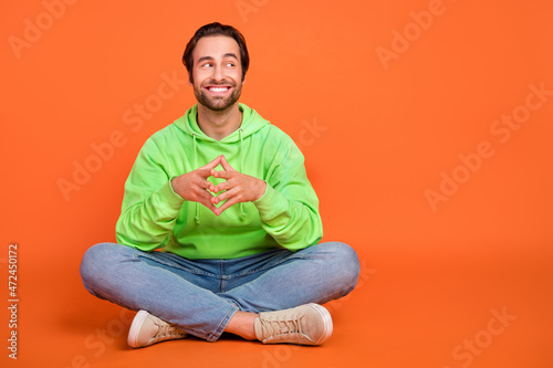 Full size photo of brunet millennial guy look empty space wear green sweater jeans footwear isolated on orange color background