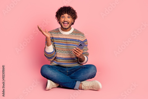 Full size photo of nice young man sit floor smart phone wear pullover isolated on pink color background