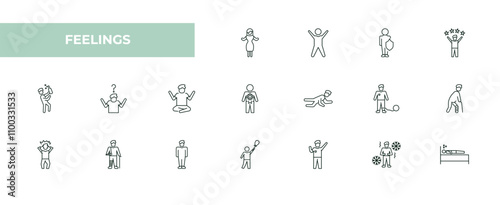 feeling, set, outline, icon, vector, collection, template, human, character, health, medicals, person, hope, free, broken, crazy, bruised, justice, down, special, man, confused, happy, safe, people, woman, thin, line, concept, signs