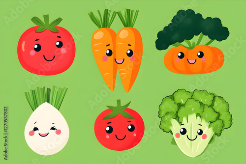 Fun and Cheerful Vegetable Characters in Kawaii Style, Smiling Faces on Fresh Organic Produce for Digital Art