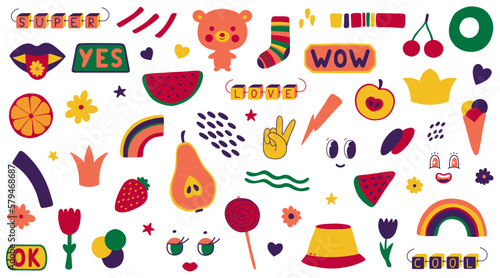 90s, retro, eye, lip, lollipop, daisy, victory, nubes, sock, ice cream, bracelet, love, panama, lightning, rainbow, crown, bear, star, super, cool, orange, apple, watermelon, cherry, strawberry, pear, ok, yes, wow, groovy, vintage, children, vibe, sticker, 1970s, 1980, 1970, 70s, 80s, hand, fruit, abstract, shape, set, vector