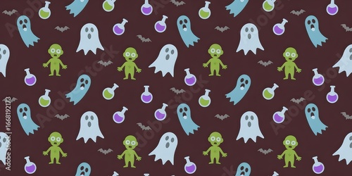 Fun Halloween Seamless Pattern Featuring Cute Ghosts, Zombies, Bats, and Potion Bottles on a Dark Background for Festive Designs.