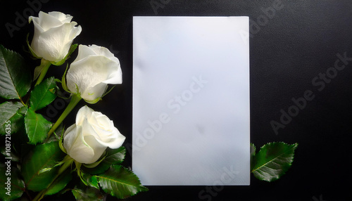 Funeral or wake invitation with white roses. white paper mockup on black table copy space.