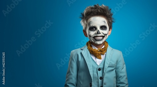 Funny boy with Halloween skull makeup on a blue background. Generative AI.