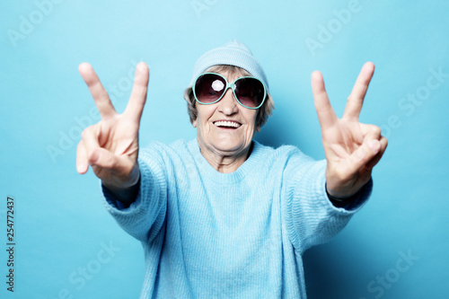 Funny old lady wearing blue sweater, hat and sunglasses showing victory sign. Isolated on blue background.