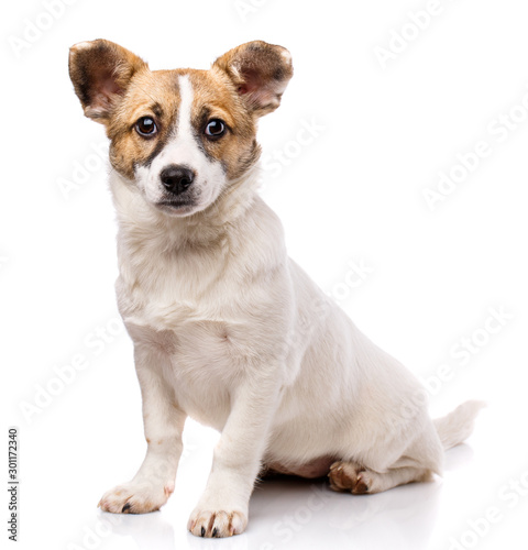 Funny puppy sits sideways. Isolated on a white background
