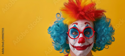 Funny sad clown with colorful wig on the yellow background, copy space for text