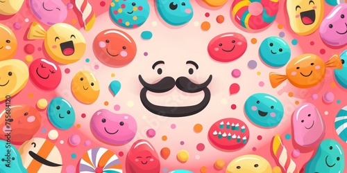 Funny smiling faces with mustaches and candy for April Fool's Day poster design. Background with text April Fools' Day and cartoon emoji smiley faces, mustache, clown hat