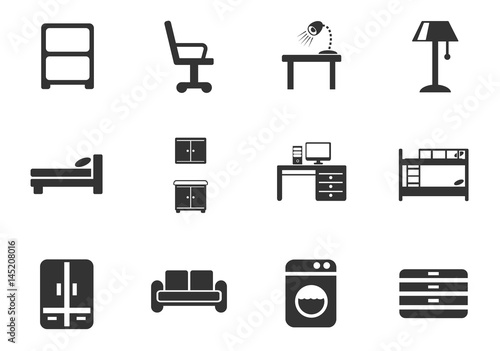 icon, symbol, vector, furniture, shelf, chair, table, lamp, bed, kitchen, computer, case, sofa, washing machine, dresser