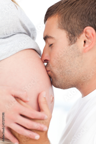 Future father kissing the belly of his pregnant wife