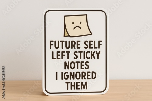 sticky, note, future, self, ignoring, advice, funny, humor, past, present, time, travel, reminder, note, message, communication, panel, text, writing, cartoon, illustration, drawing, design, graphic, concept, idea, white, light, wood, surface, table, desk, office, home