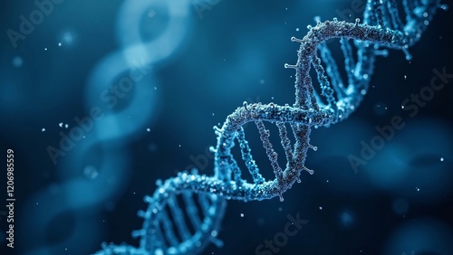 Futuristic 3D DNA Strand with Glowing Particles on Blue Background
