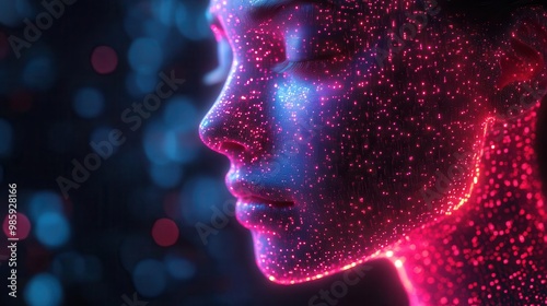 futuristic 3d rendering of human head composed of glowing digital blocks neon blues and purples create a cyberpunk aesthetic representing artificial intelligence and consciousness