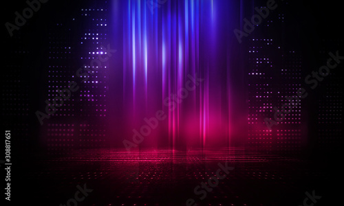 Futuristic abstract blue and pink neon background, luminous geometric figure in the center. Abstract light, rays and lines. Empty night scene.